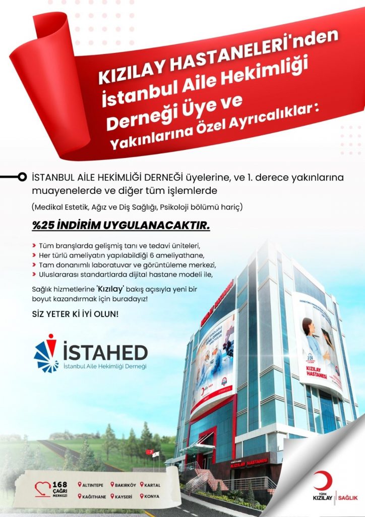 Protokole göre; üye aile hekimlerimiz ve 1.derece yakınları Kızılay Hastanelerinde muayene ve diğer tüm hizmetlerinden %25 indirimli yaralanacaktır. (Medikal Estetik, Ağız ve Diş Sağlığı, Psikoloji Bölümleri Hariç)